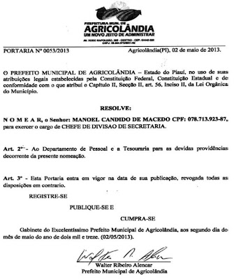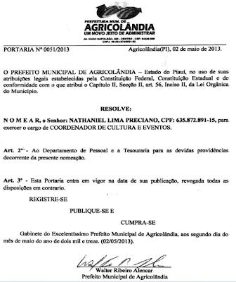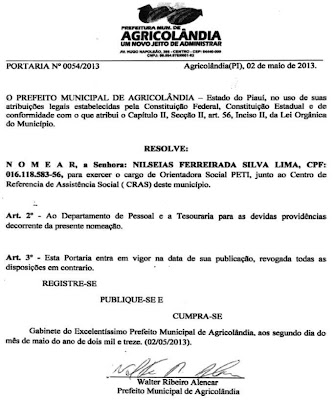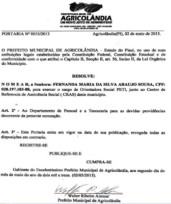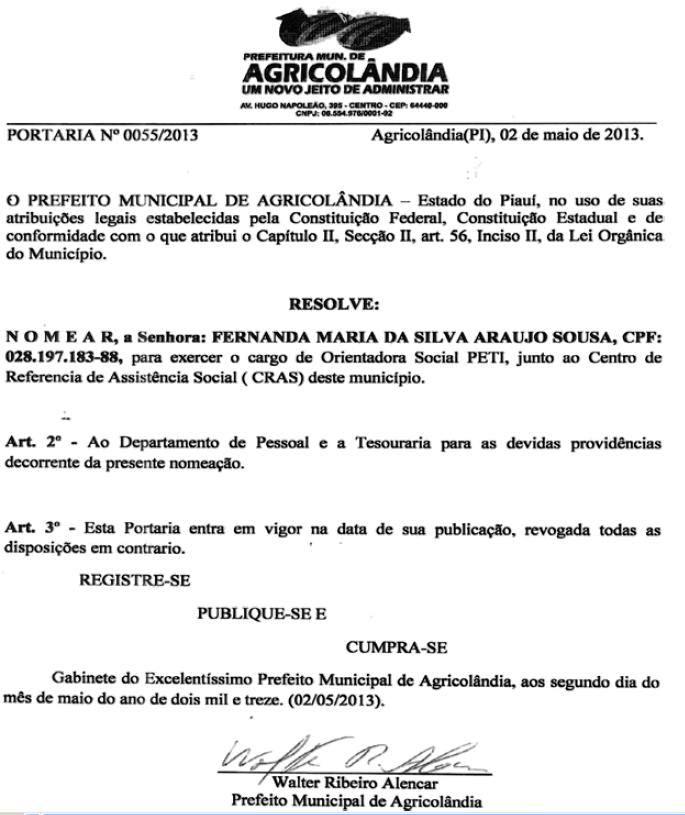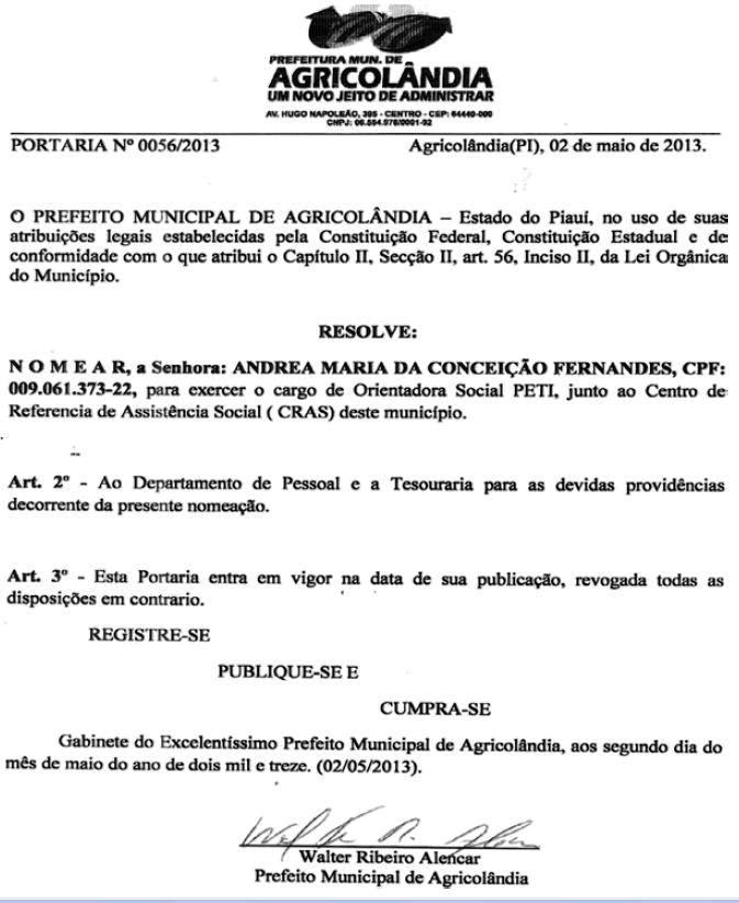 O prefeito Municipal da cidade de Agricolândia Piauí, no uso de suas atribuições legais estabelecidas pela Constituição Federal, Estadual Lei Orgânica do Município e em conformidade com o Art. 56 Capitulo II, resolve nomear os seguintes prestadores de serviços e com suas respectivas funções.· Andrea Maria da Conceição Fernandes – Função – Orientadora Social do programa PETI;· Elisangela Lima Ribeiro – Função – Entrevistadora do Programa Bolsa Família;· Fernanda Maria da Silva Araujo Sousa – Função – Orientadora Social do Programa PETI;· Manoel Candido de Macedo – Função – Chefe de divisão de Secretaria;· Natália Carlos de Alencar – Função – Orientadora Social do Programa Projovem;· Nathanael Lima Preciano – Função – Coordenador de Culturas e Eventos· Nilseias Ferreira da Silva Lima – Função – Orientadora Social do Programa PETI;